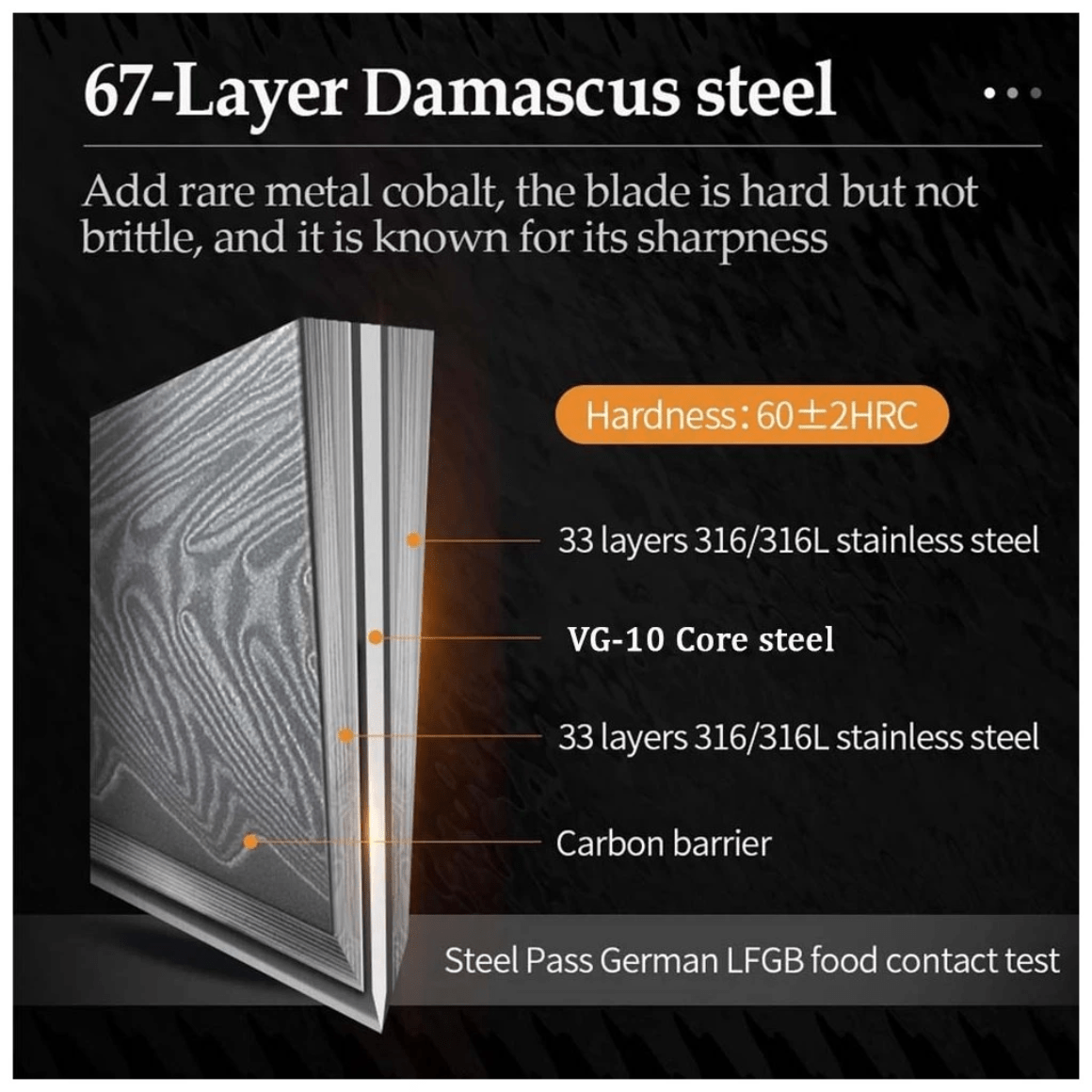 Jadro čepele je vyrobené z japonskej ocele VG10, ktorá je dobre chránená proti korózii. Japonská oceľ VG10 má dlhotrvajúcu ostrosť pri tvrdosti R61 +/- 1 Rockwell. Jadro japonskej ocele VG10 je vložené medzi 66 vrstiev 2 nerezových damascénskych ocelí, ktoré poskytujú výnimočnú odolnosť a húževnatosť.