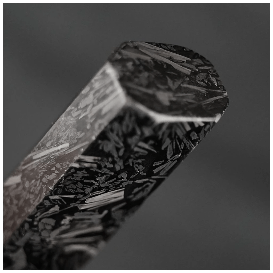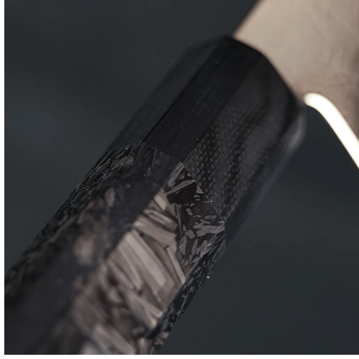 Rukoväť v tradičnom osemuholníkovom dizajne poskytuje bezpečný a pohodlný úchop aj v náročných podmienkach. Je vyrobená z tmavého carbon fiber, ktorý pripomína nekonečný vesmír s čiernym G10, čo je kompozitný materiál extrémne odolný voči vlhkosti, zmenám teploty a mechanickému opotrebeniu.
