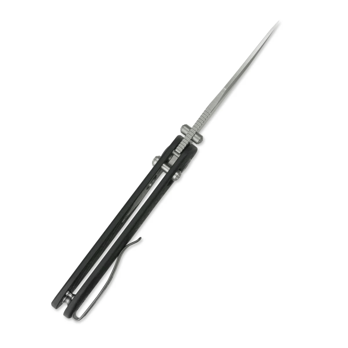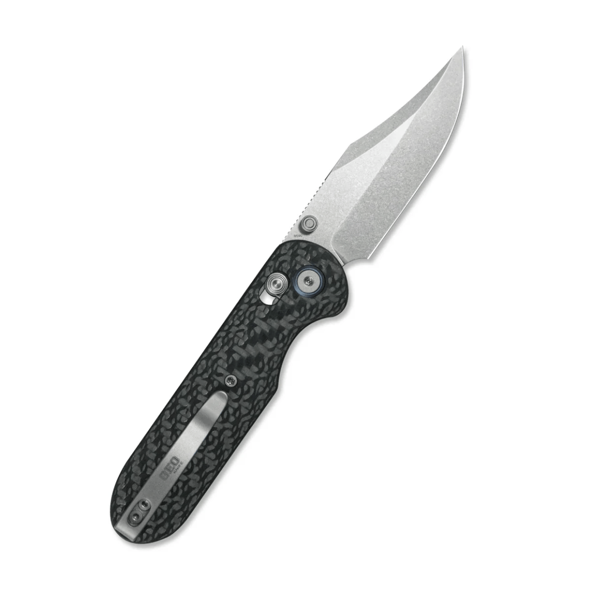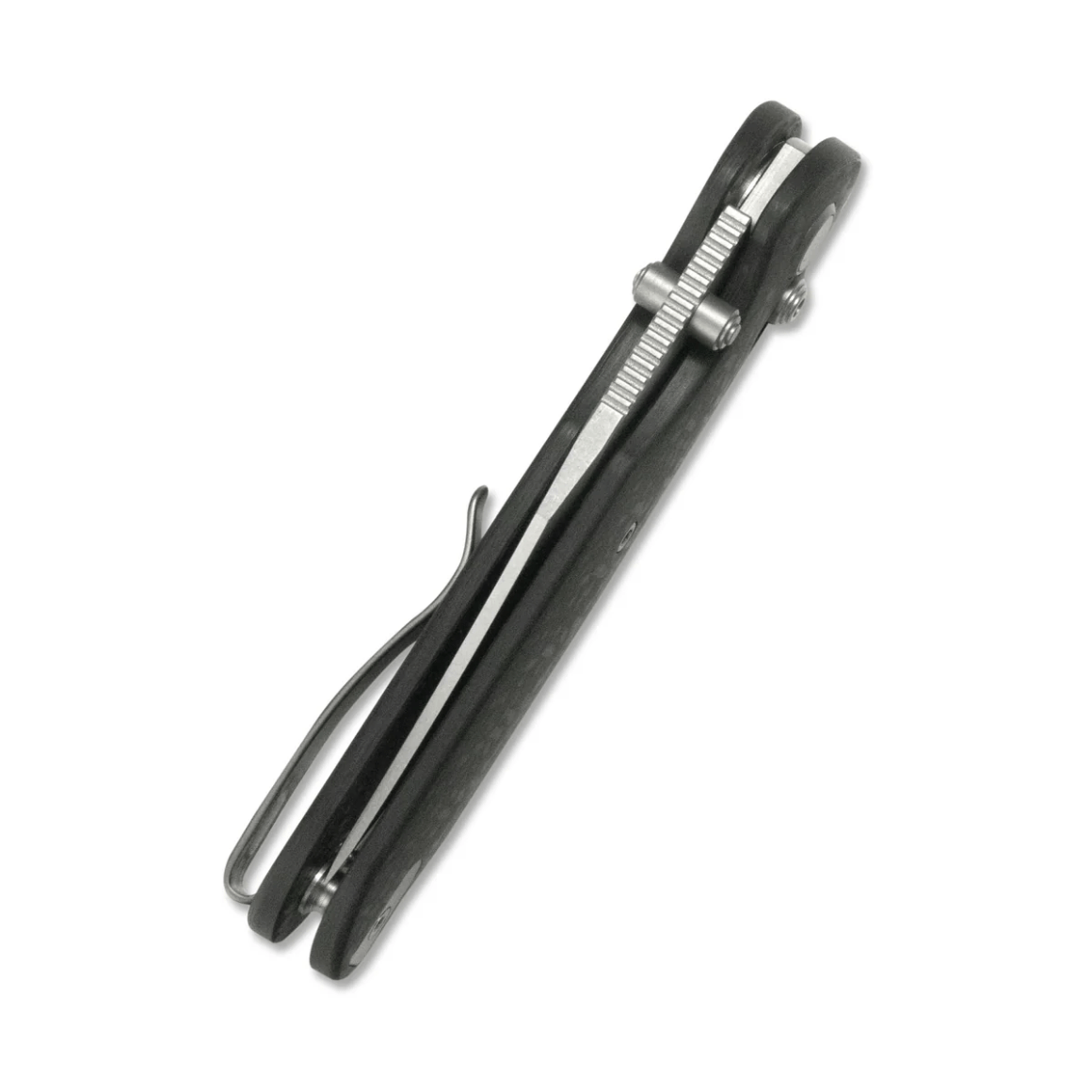 Rukoväť je vyrobená z čierneho carbon fiber, čo je neuveriteľne silný materiál. Uhlíkové vlákna, často najprv tkané, sú stlačené do silnej živice pod vysokým tlakom. Výsledkom je super silný, ľahký materiál. Klieština je titánová a nastavená pre tip-up nosenie na pravej strane.