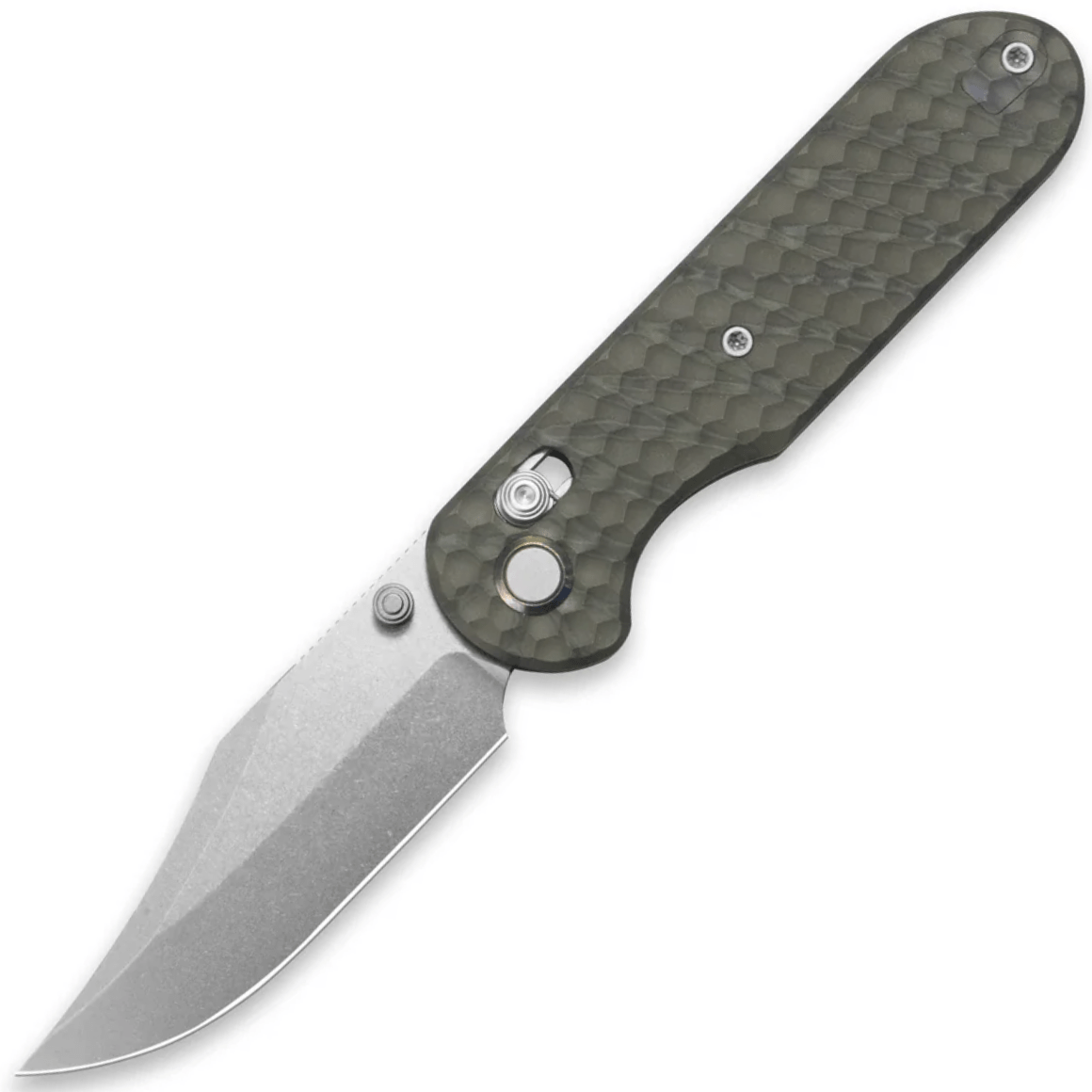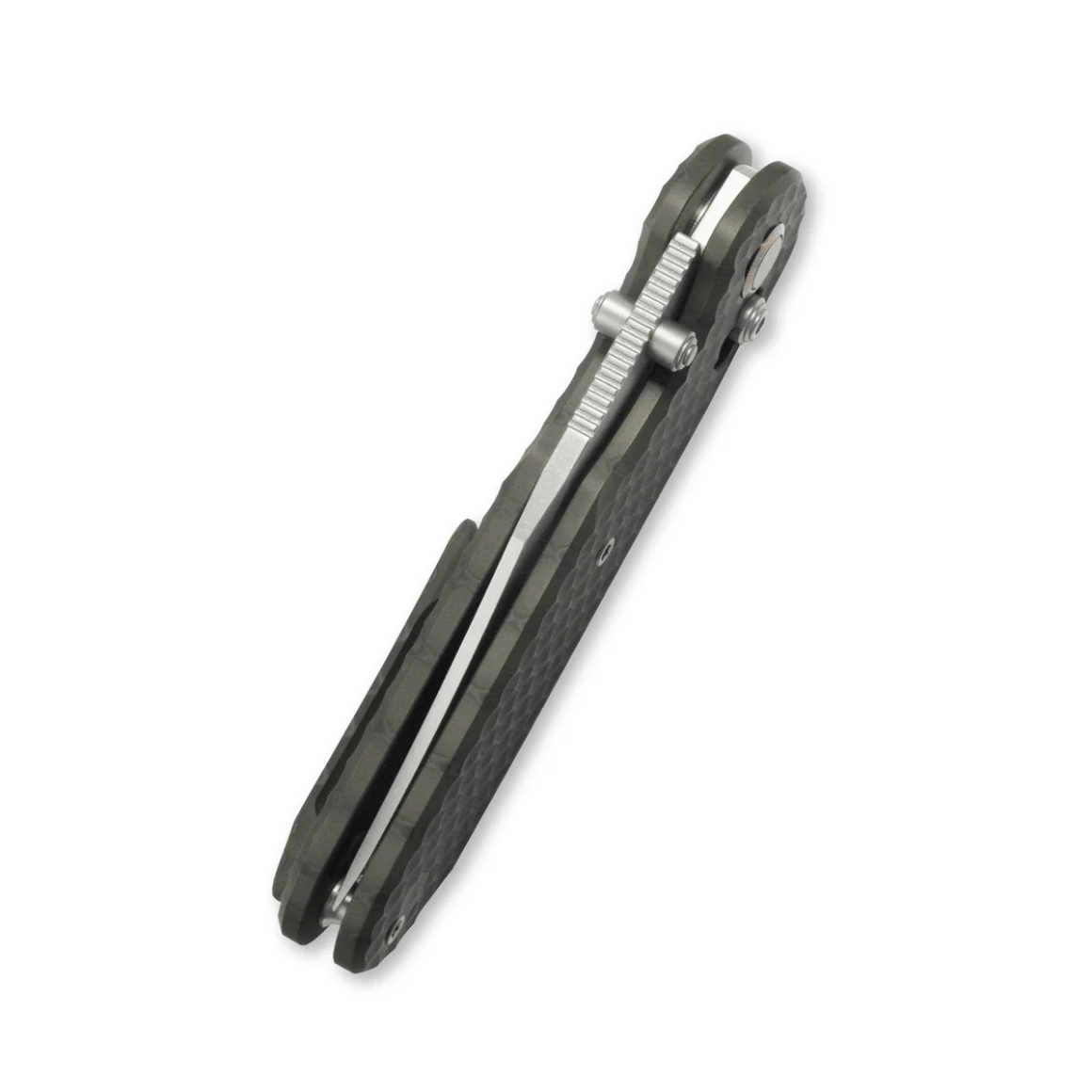 Rukoväť je vyrobená z titánu 6AL4V s textúrou Tiger Stripe v tvare plameňového včelieho plástu pre lepší úchop a odolnosť. Klieština je titánová a nastavená pre tip-up nosenie na pravej strane.