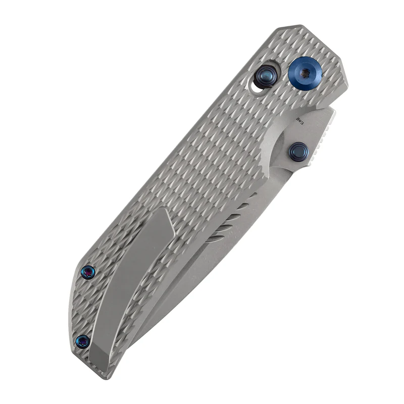 Ergonomicky frézovaná titánová rukoväť s nádherným diamantovým vzorom zaručuje pevný, protišmykový úchop, ponúkajúci pohodlie a kontrolu v každej situácii. Spojenie estetiky a kvality robí z tohto noža vysoko zberateľský kúsok!