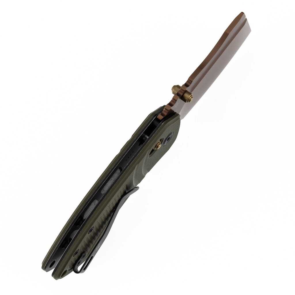 Rukoväť z olivovo zelenej G10 poskytuje hladký povrch pre pohodlný úchop v ruke aj vo vrecku.