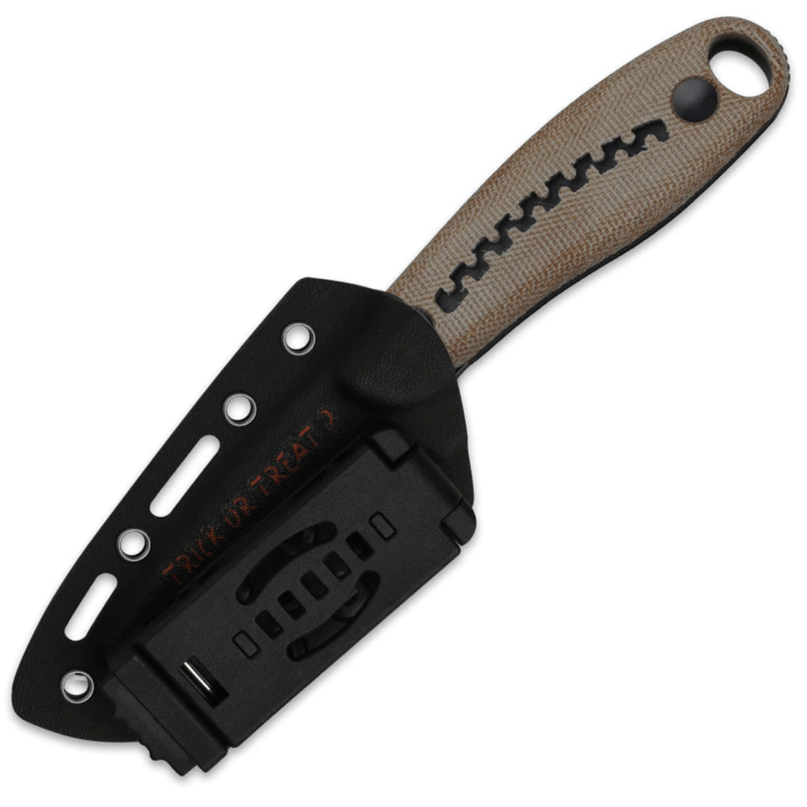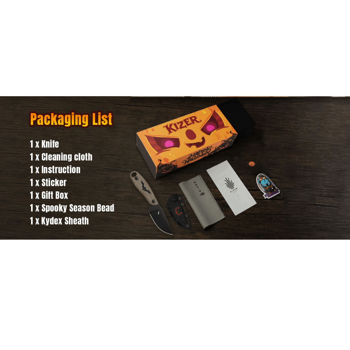 Balenie obsahuje: nôž, čistiacu handričku, návod, nálepku, darčekovú krabičku, korálku s halloweenskym motívom, Kydex puzdro