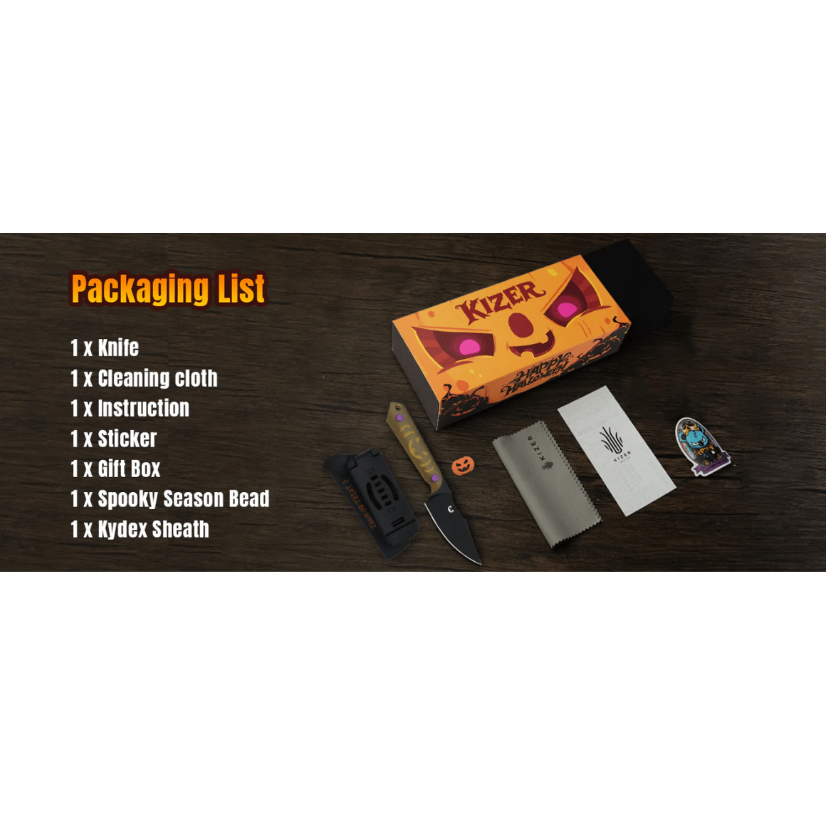 Balenie obsahuje: nôž, čistiacu handričku, návod, nálepku, darčekovú krabičku, korálku na strašidelnú sezónu, Kydex puzdro