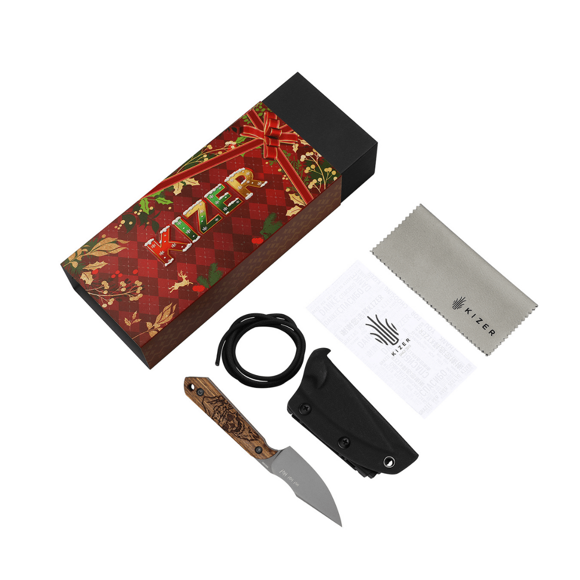 Dodáva sa s Kydex puzdrom s viacerými možnosťami nosenia pre optimálny komfort používateľa. V balení je tiež čistiaca handrička, šnúrka a vianočná krabička.