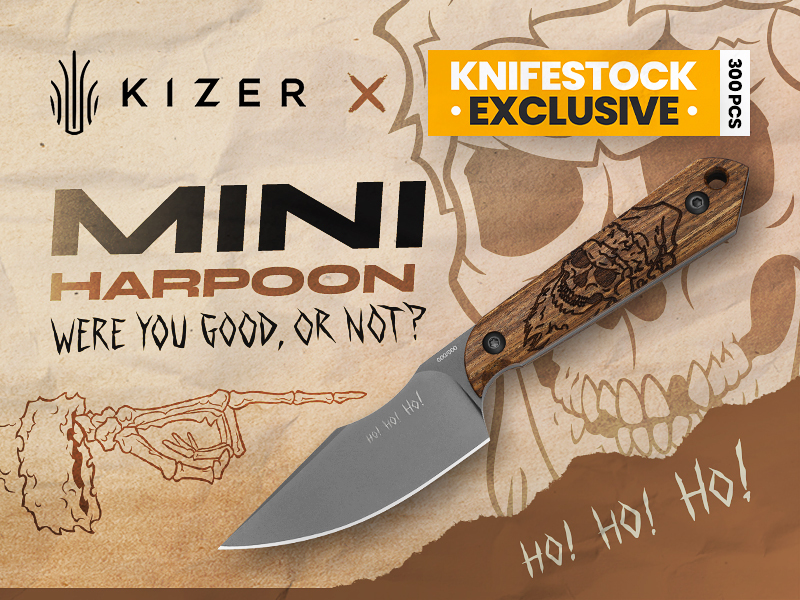 Kizer Mini Harpoon - Mkuruti Wood 1040SE2 v limitovanej edícii 300 kusov, exkluzívne vyrobený v spolupráci medzi Kizer a Knifestock. Unikátny dizajn s motívom "Santa Claus z podsvetia" bol vytvorený naším interným dizajnérom Jánom Polákom.