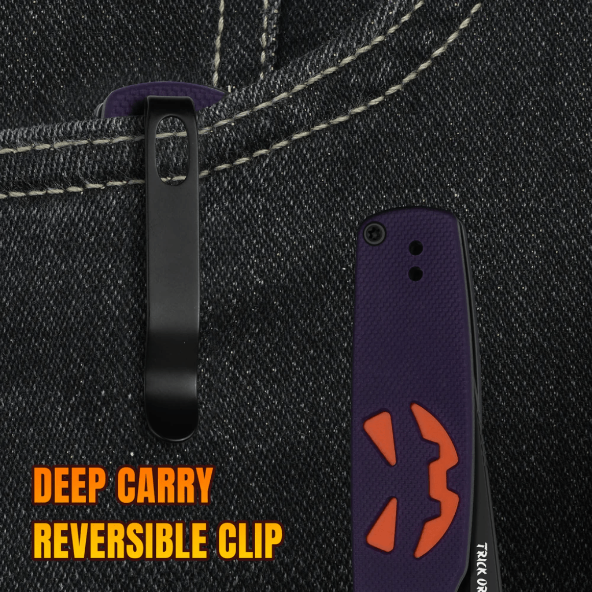 Rukoväť je vyrobená z fialového a oranžového G10 s vyrezávaným dizajnom tekvice Jack-O'-Lantern a netopiera. G10 je kompozitný materiál zložený zo sklených vlákien a syntetickej živice. Vďaka jemnej textúre G10 sa dobre drží v ruke a ponúka dostatok úchopu.