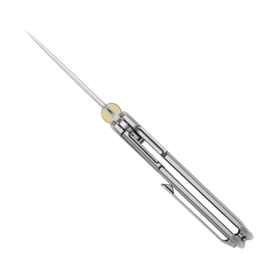 Quoll ponúka rýchle otváranie jednou rukou pomocou disku na palec a predného flippera. Mosadzné alebo titánové disky ladia s farbou každej vložky pre rafinovaný, jednotný vzhľad. Pevný frame lock zaisťuje bezpečné a spoľahlivé používanie.