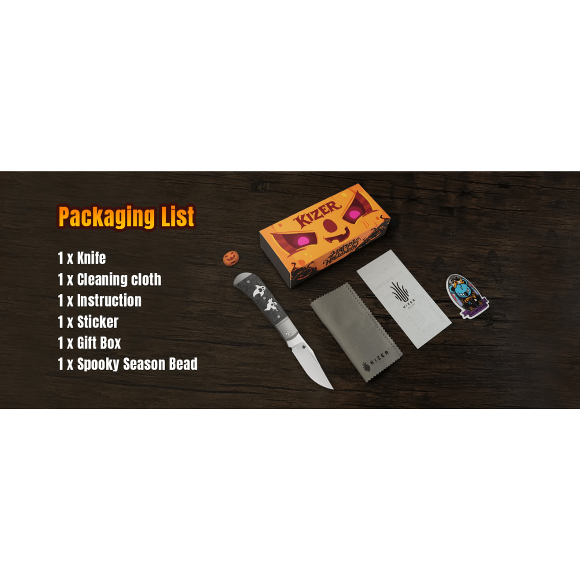 Balenie: nôž, čistiaca handrička, návod, nálepka, darčeková krabička, korálka na tému strašidelnej sezóny