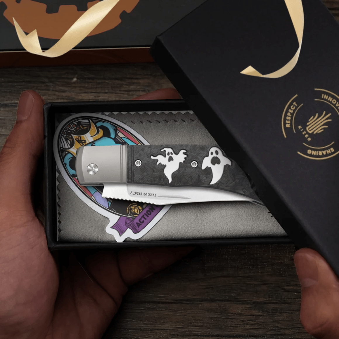 Zatvárací vreckový nôž Kizer Trestle 14C28N Aluminium + Carbon Fiber V3761HW1 - Halloween edícia, navrhnutý dizajnérom Azo, spája prémiové materiály s čistým a funkčným dizajnom.