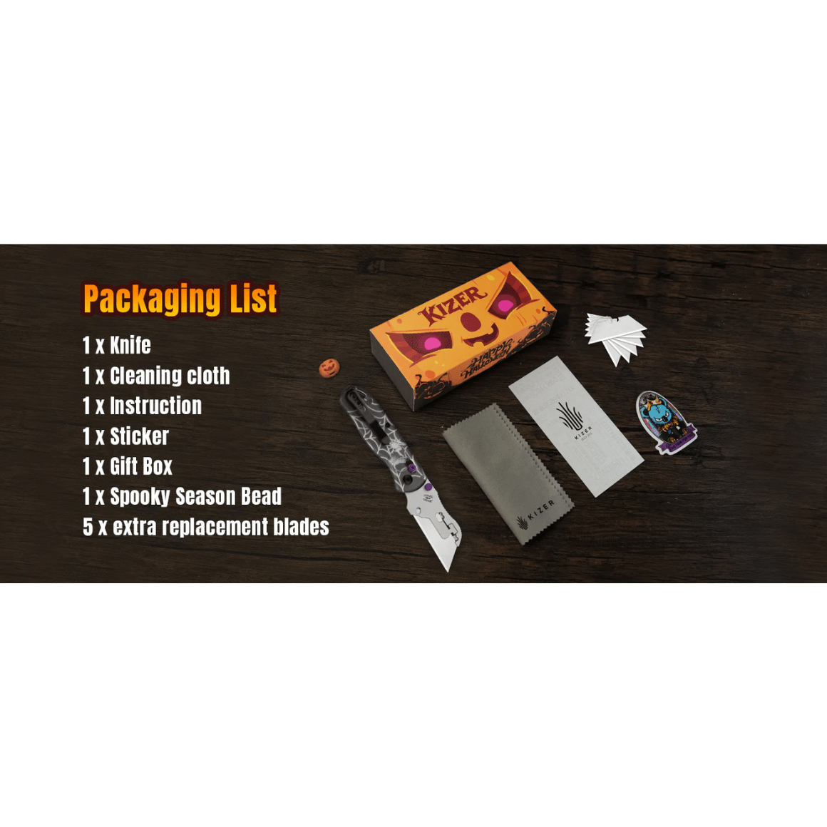 Balenie: nôž, čistiaca handrička, návod, nálepka, darčeková krabička, korálka na tému spooky season, 5x náhradné čepele