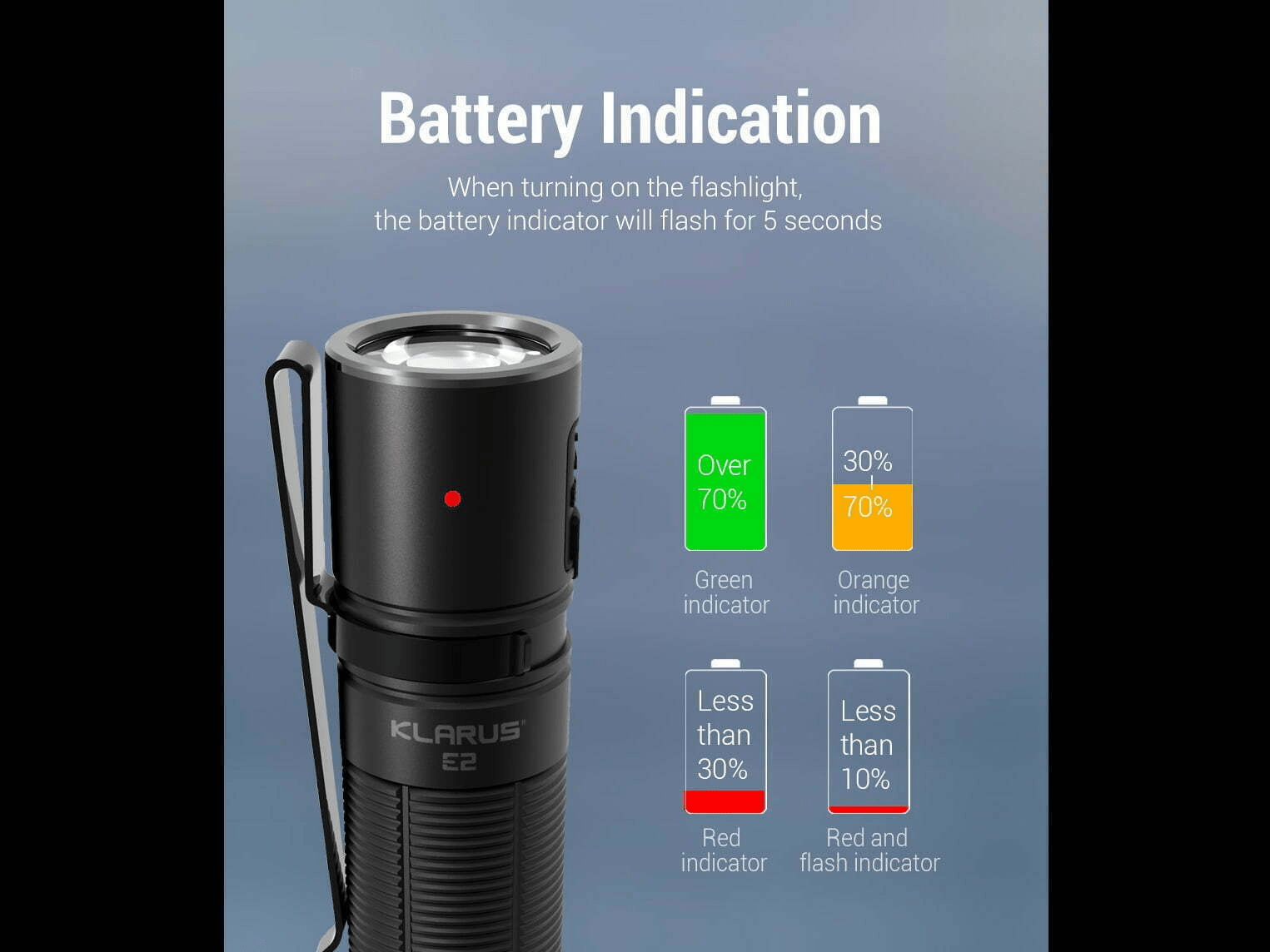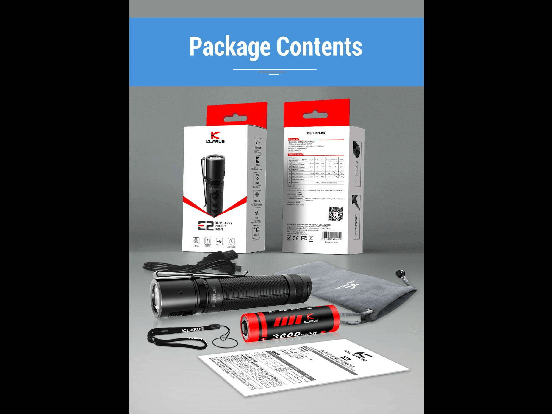 Súčasťou balenia je: Svietidlo E2, Prenosné ochranné vrecúško, USB nabíjací kábel, O-krúžok, šnúrka na zápästie, 1x KLARUS batéria 18GT-E36 (LiR 18650 3,6V 3600mAh nabíjateľná „+/-„ na jednom konci).
