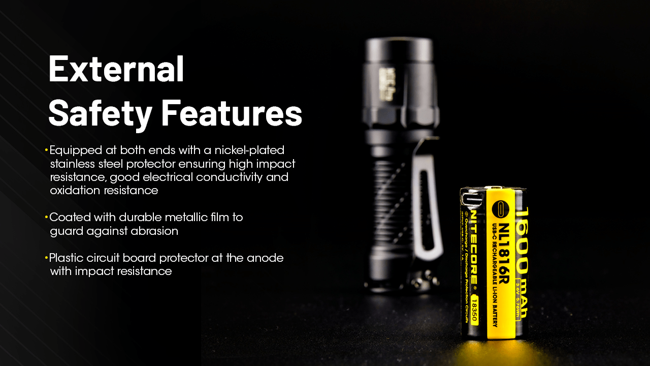 Batéria NL1816R je vybavená inteligentným ochranným obvodom na ochranu batérie pred prebitím, nadmerným vybíjaním a skratovaním. Je vyhotovená z prvotriednych materiálov, ako sú poniklované kryty z nehrdzavejúcej ocele, ktoré ju chránia pred nárazmi, zabezpečujú účinnú vodivosť a odolnosť voči oxidácii. Okrem toho je batéria potiahnutá odolnou kovovou vrstvou, ktorá zvyšuje jej odolnosť voči oderu.