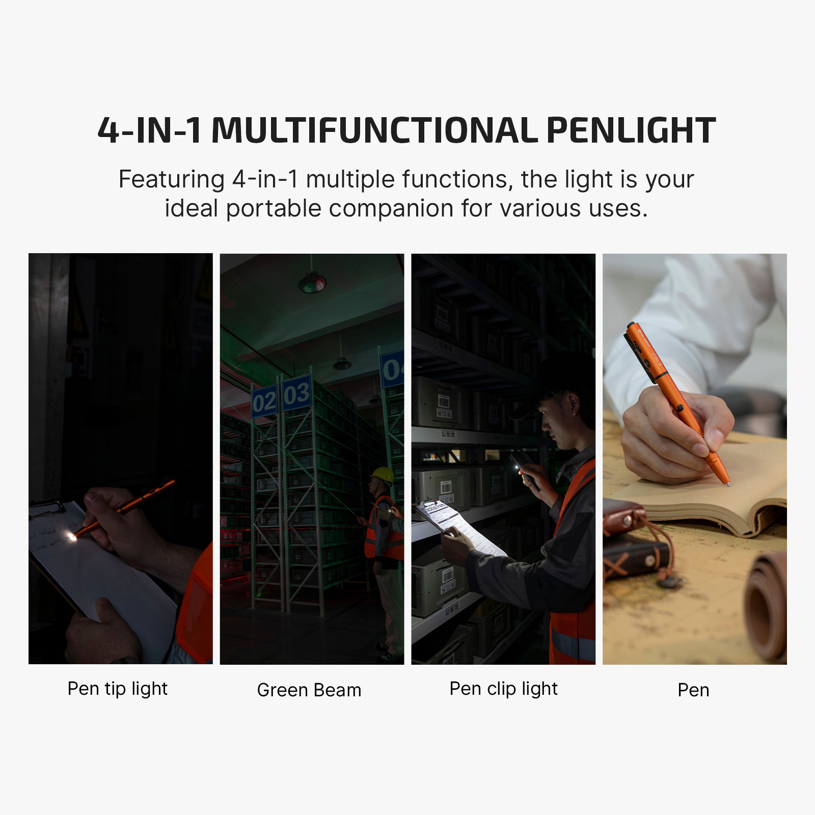 4-v-1 Multifunkčné pero s LED svetlom: Klip obsahuje biele svetlo s intenzitou 120 lúmenov, dvojstupňové červené svetlo pre nočné videnie a červený SOS režim pre núdzové situácie. Ďalej je vybavené jemným svetlom na písanie v tme a presným zeleným laserovým ukazovateľom triedy 3R s dvoma úrovňami jasu pre jasné a sebavedomé prezentácie.