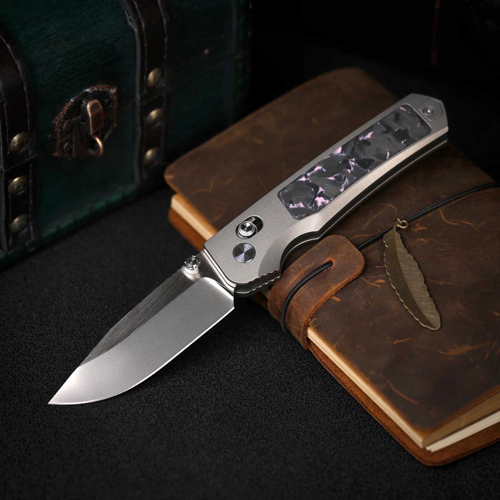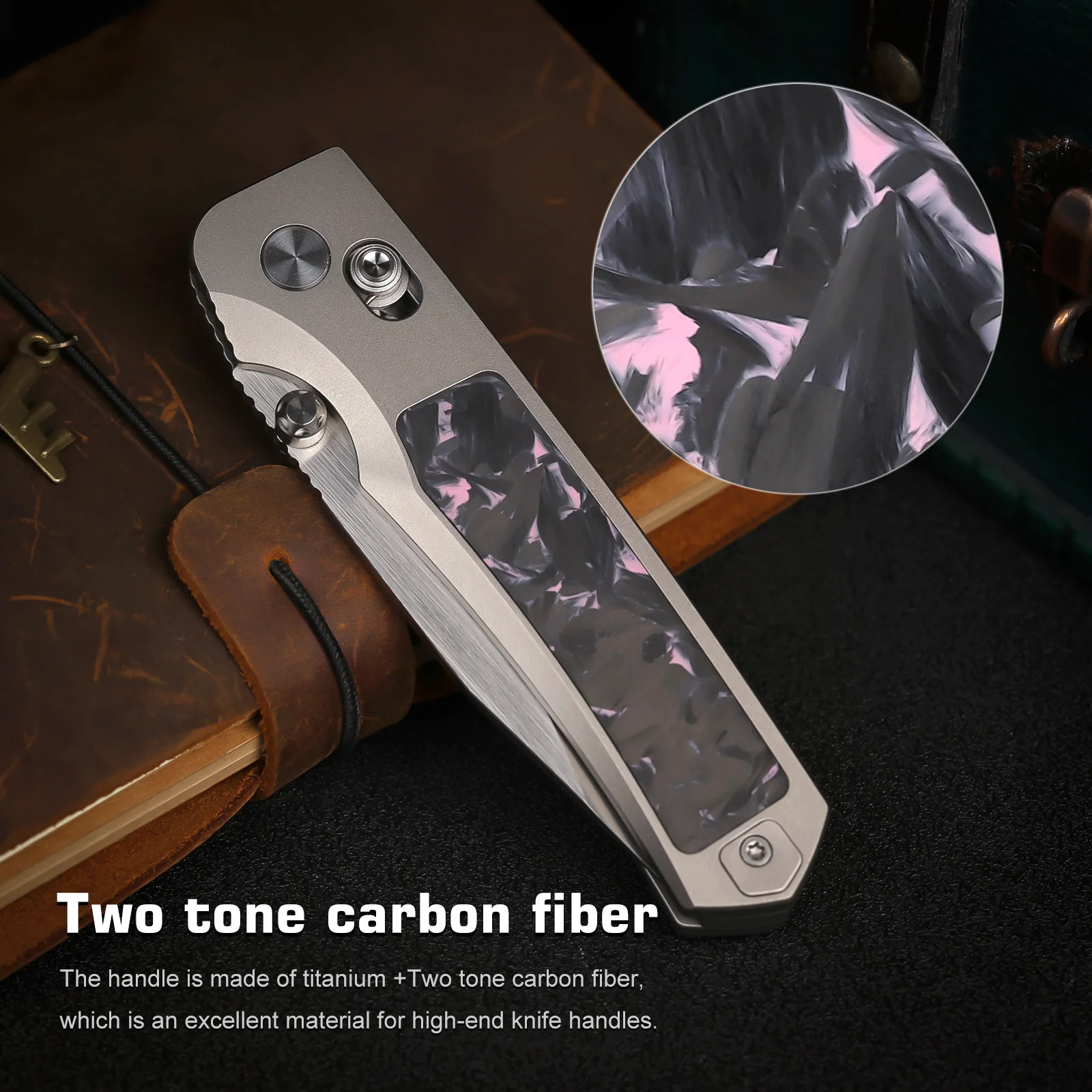 Rukoväť je vyrobená z titánu a dvojfarebného carbon fiber, čo je vynikajúci materiál pre luxusné rukoväte nožov.
