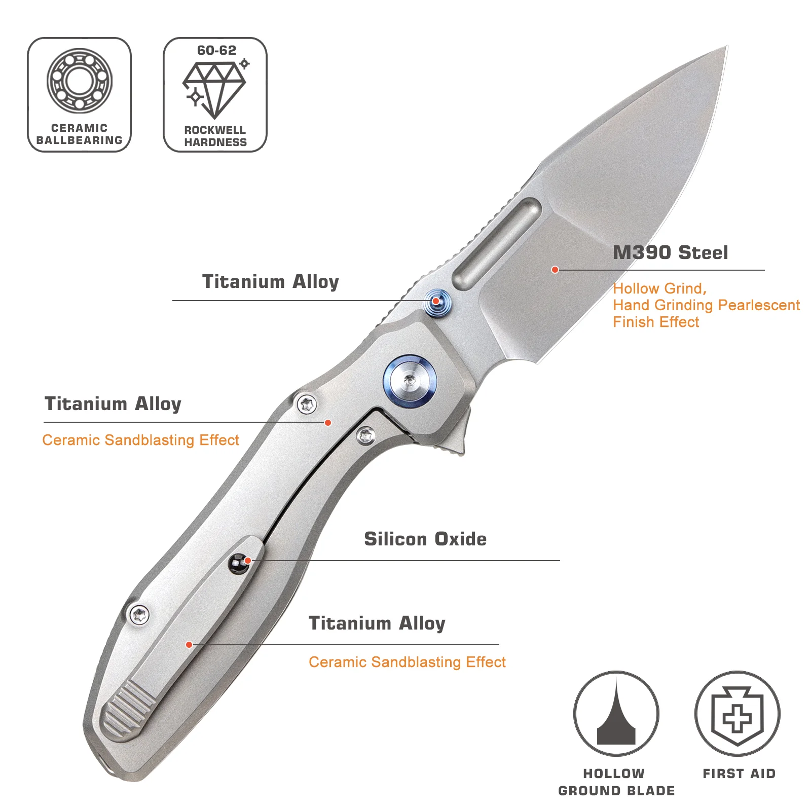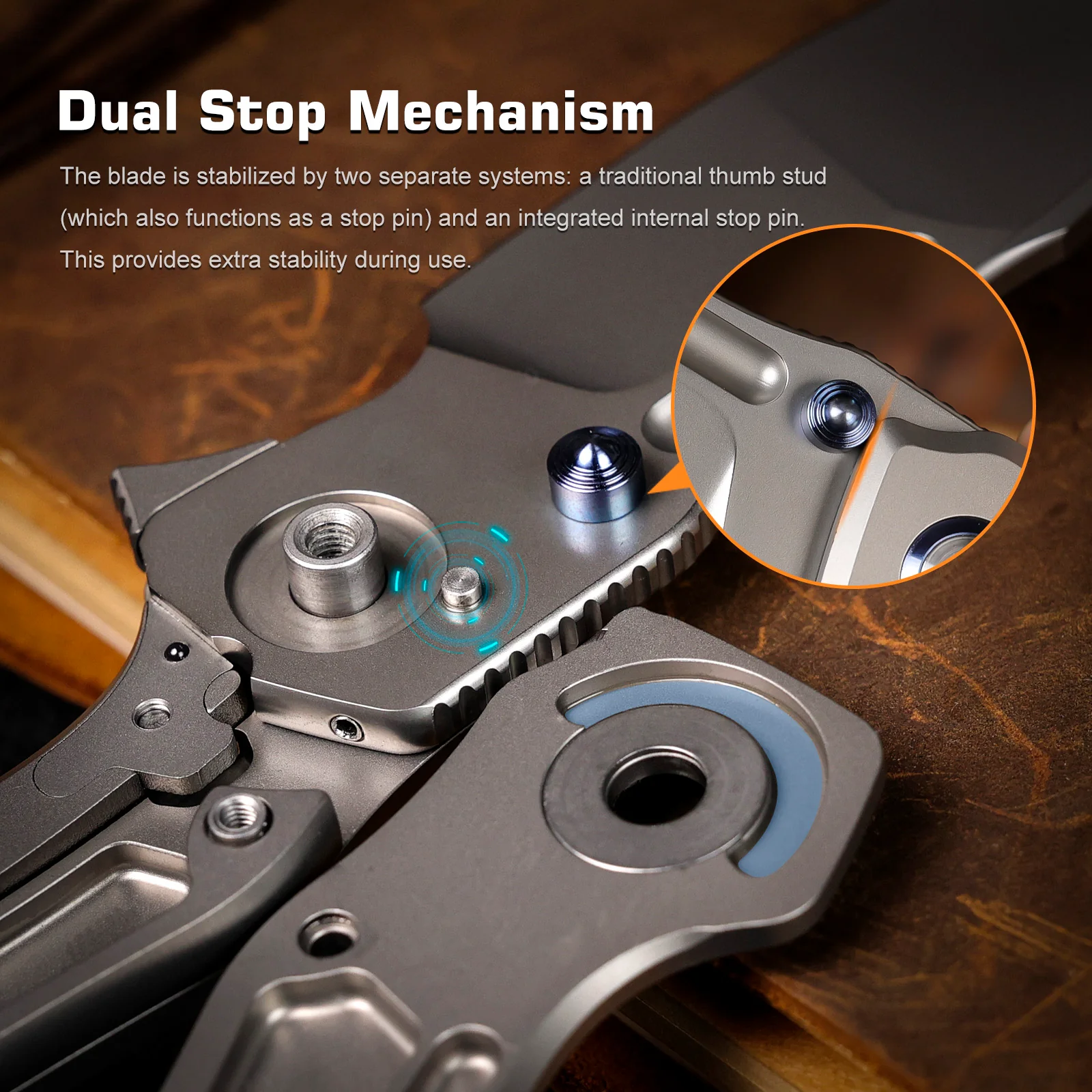 Čepeľ z ocele M390 s hrúbkou 4 mm na chrbte čepele nielenže zaručuje odolnosť, ale tiež poskytuje mimoriadne plynulý chod vďaka viacradovým ložiskám. Pre zvýšenú bezpečnosť v otvorenej polohe je čepeľ vybavená dvojitým systémom zastavenia - stop pinom a thumb studom.