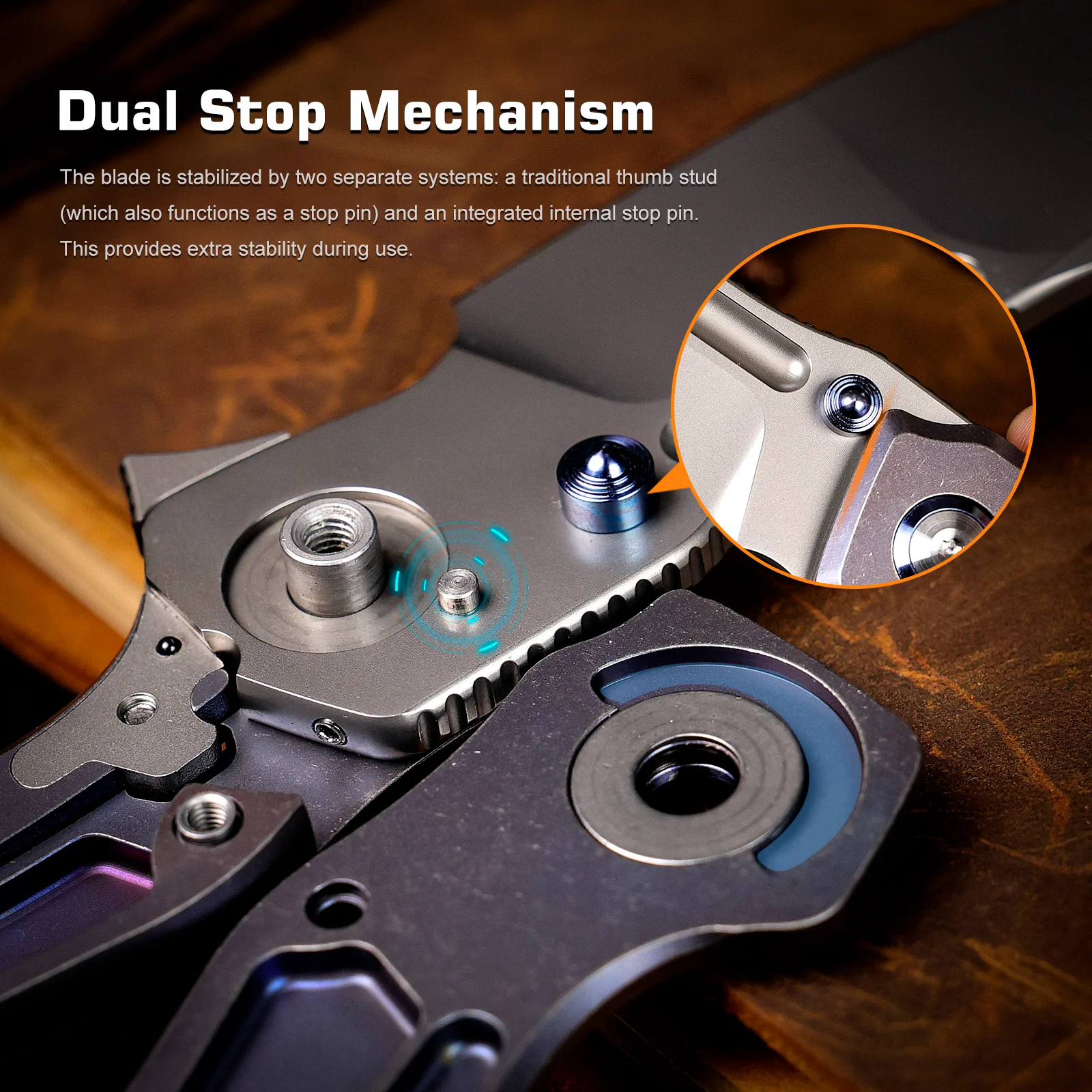 Čepeľ z ocele M390 s hrúbkou 4 mm na chrbte čepele nielenže zaručuje odolnosť, ale aj výnimočne plynulý chod vďaka viacradovým ložiskám. Pre zvýšenú bezpečnosť v otvorenej polohe je čepeľ vybavená dvojitým systémom zastavenia - stop pinom a thumb studom.