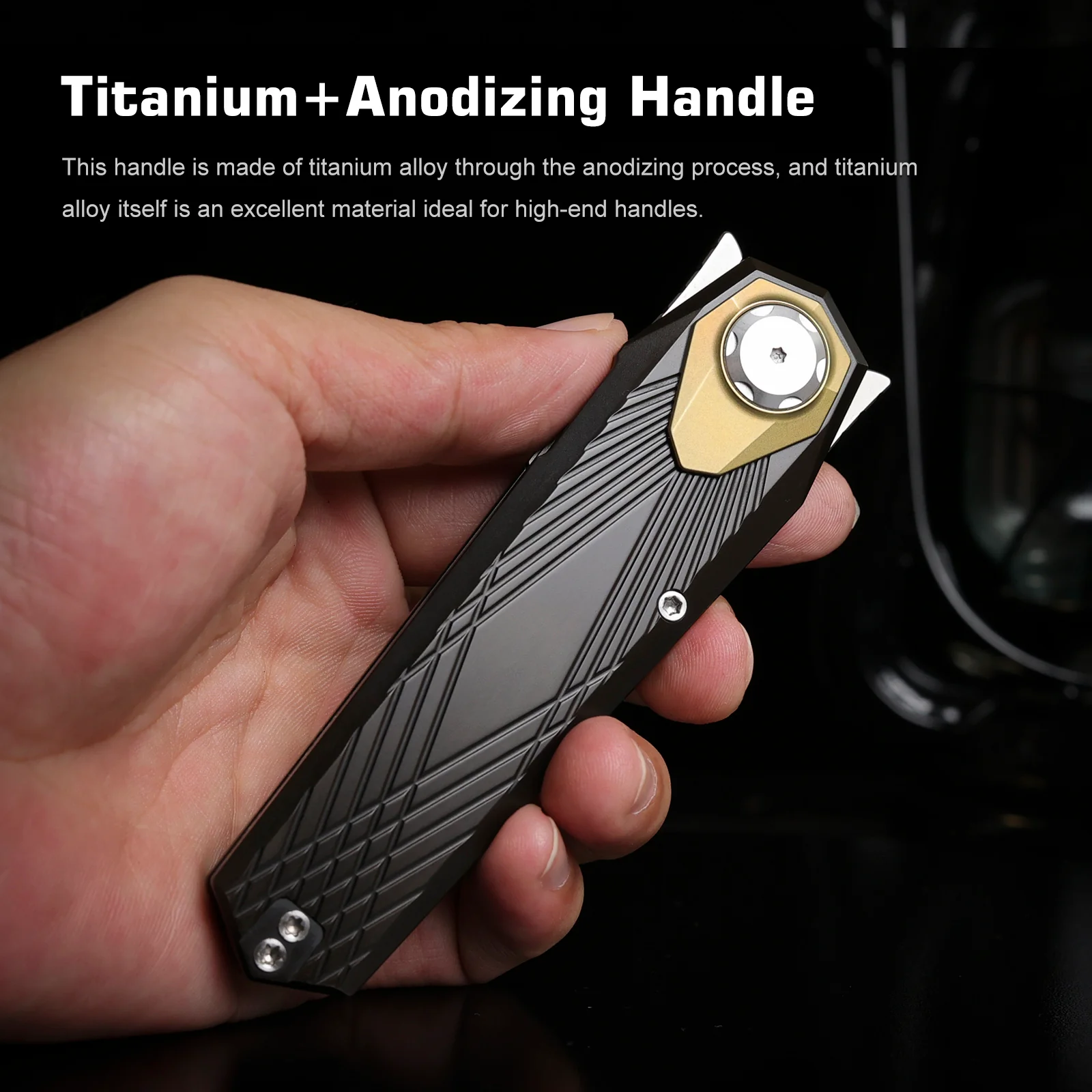 Rukoväť je z titánovej zliatiny s gravírovaním, čo je vynikajúci materiál pre luxusné rukoväte nožov.