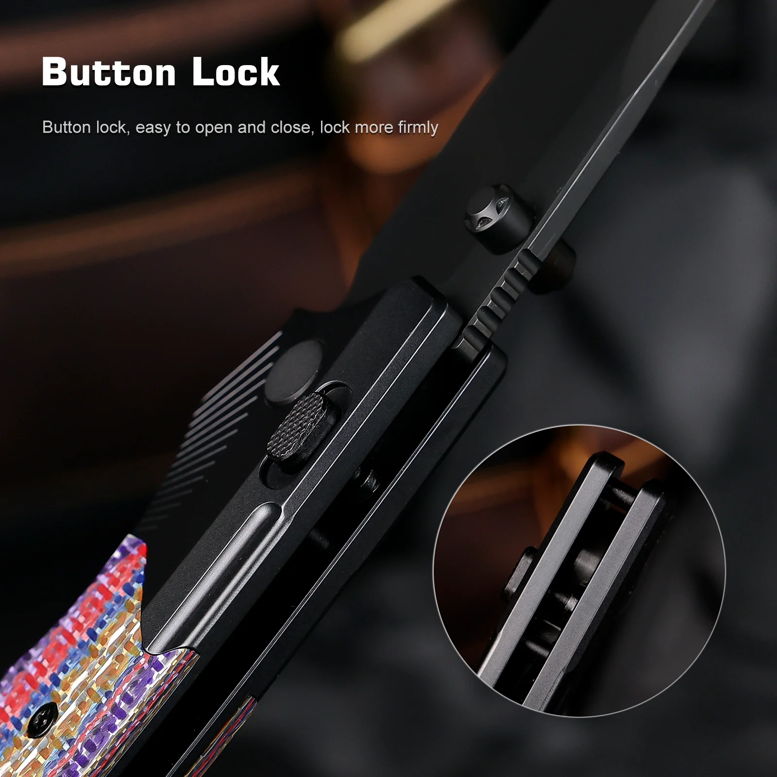 Rukoväť je vyrobená z titánu a viacfarebného carbon fiber, čo je vynikajúci materiál pre luxusné rukoväte nožov.