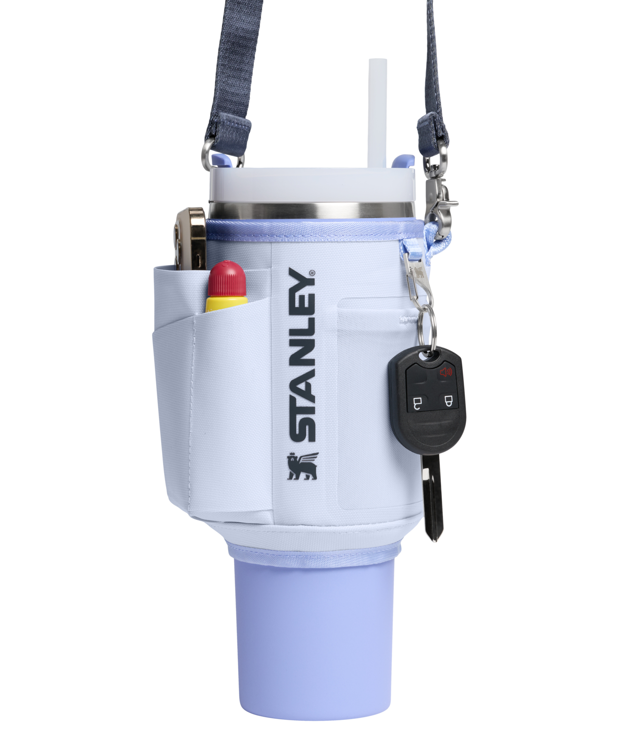Vitajte vo svete hydratácie bez použitia rúk—s vreckami! Vyrobený z recyklovaného polyesteru, štýl sa stretáva s funkčnosťou v žiarivej palete farieb. Majte Quencher® Carry-All s objemom 1,2L stále po ruke, aby ste dosiahli svoje ciele v hydratácii. Omotajte pás s motívom okrídleného medveďa okolo vášho 1,2L Quencher® a zabezpečte ho dvojitým zapínaním na cvoky. Prehoďte popruh cez telo, držte sa svojich blízkych a užívajte si zábavu. Tri vrecká, z ktorých jedno je dostatočne priestranné na telefón, zatiaľ čo druhé pod ním uskladní tenkú peňaženku alebo obal na karty. Menšie sieťované vrecko pojme kompaktné slúchadlá, balzam na pery alebo malé nevyhnutnosti, bez ktorých sa nezaobídete. Premyslený dizajn zahŕňa aj špeciálny obal na slnečné okuliare. Nechýba ani klip na kľúče! Odopnite popruh a vymieňajte si farby s najlepším priateľom. Kamkoľvek vás dobré časy zavedú, pohybujte sa voľne a zostaňte hydratovaní so Stanley.