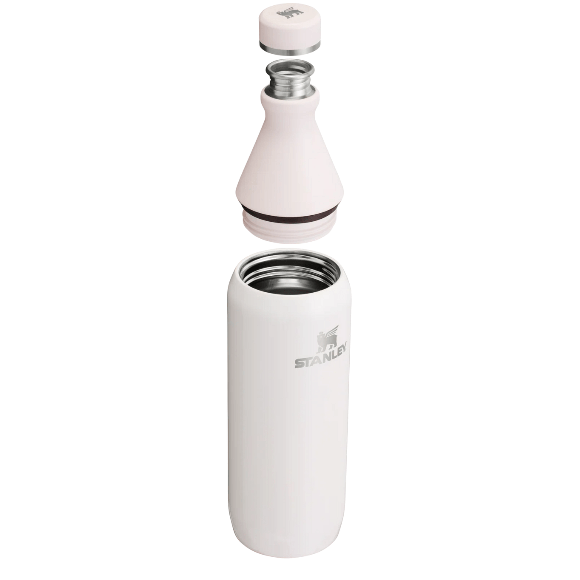 Štýlová termofľaša STANLEY The all Day Slim Bottle 350 ml Rose Quartz Gloss v jemnej ružovej farbe, vhodná do mesta i do prírody, v tvare kuželky. Vďaka dvojitému uzáveru sa z nej ľahko pije, jednoducho sa umýva a dobre sa z nej nalieva.