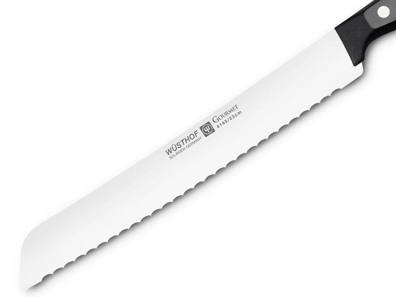 Nôž na chlieb Wüsthof GOURMET s čepeľou dlhou 23 cm so zúbkovaním na krájanie čerstvých a chrumkavých chlebov, ale aj tvrdých kôrok a tort. Rukoväť je z čierneho syntetického materiálu POM.