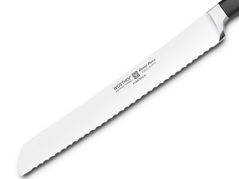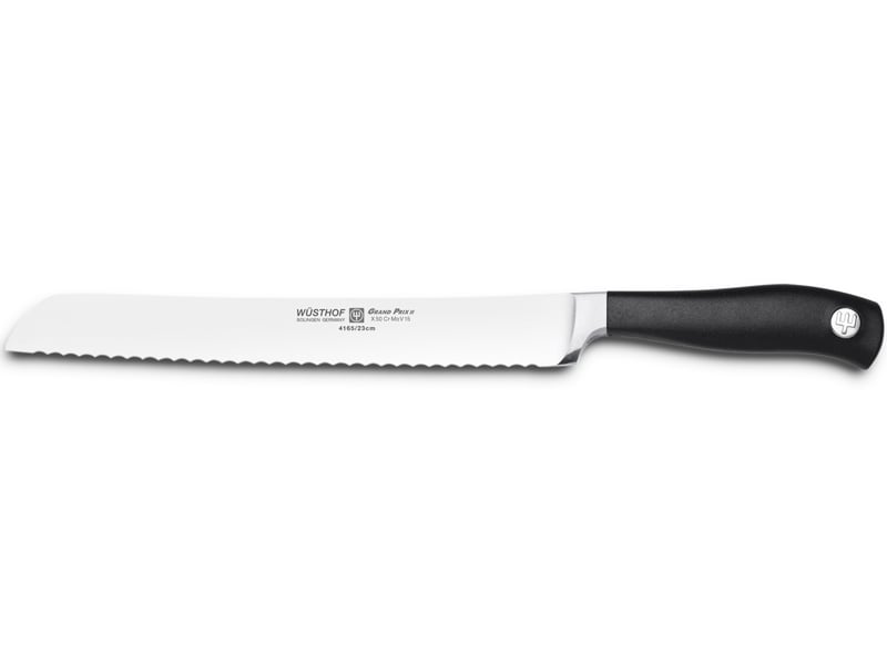Nôž na chlieb Wüsthof GRAND PRIX II s čepeľou dlhou 23 cm so zúbkovaním na krájanie čerstvých a chrumkavých chlebov, ale aj tvrdých kôrok a tort. Rukoväť je z čierneho plastu.