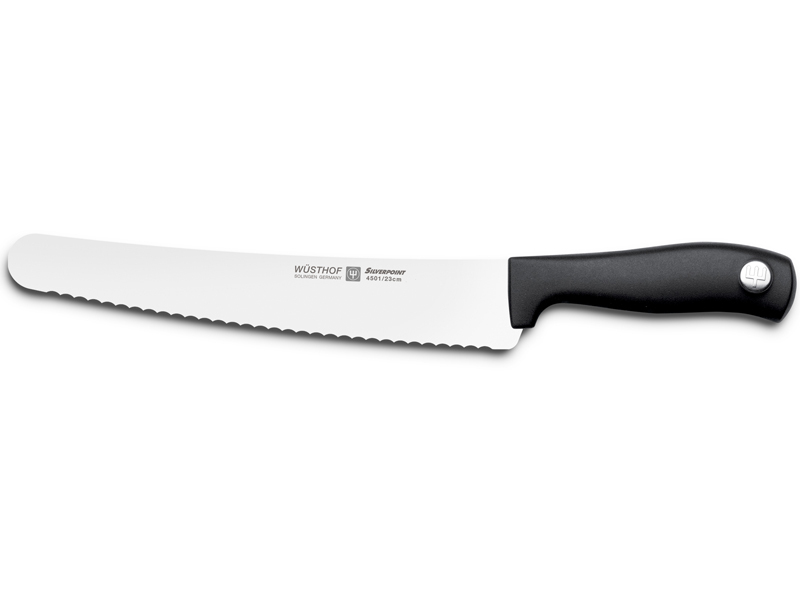 Cukrársky nôž Wüsthof SILVERPOINT naporcuje okrem narodeninových tort a koláčov aj chleba či pečiva. Má zúbkovanú čepeľ dlhú 23 cm z ocele X50CrMoV15 a čiernu plastovú rukoväť.