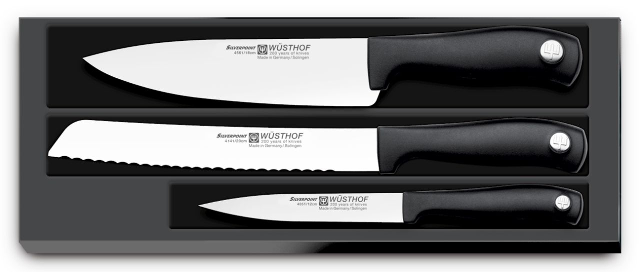 Sada 3 kuchynských nožov Wusthof Silverpoint má čepele z nehrdzavejúcej ocele a čierne rukoväte zo syntetiky.
