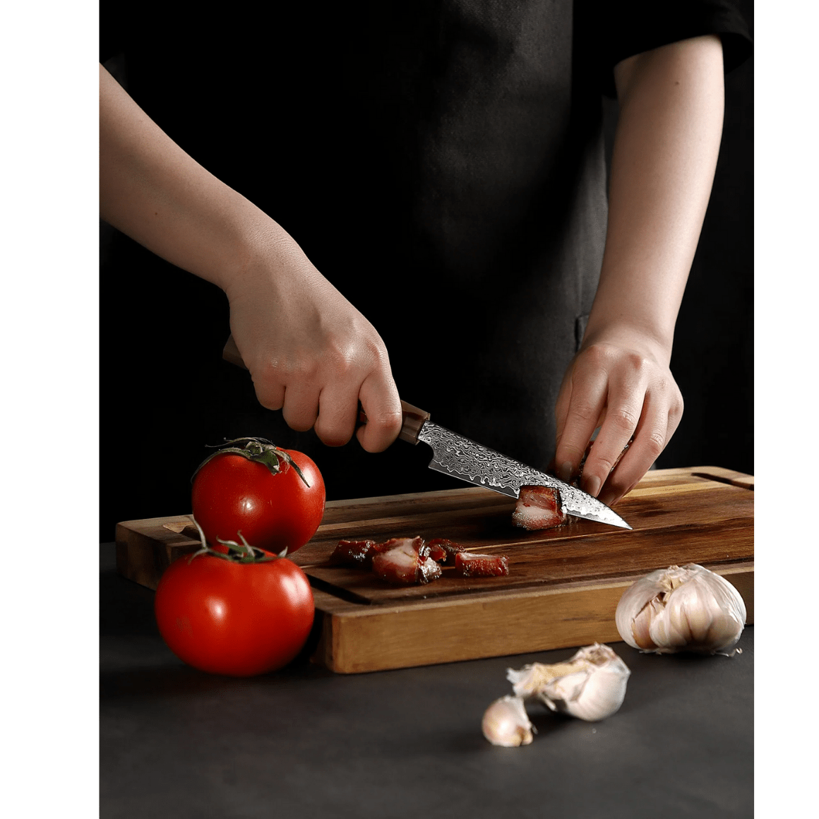 Čepeľ je vyrobená z 67-vrstvovej VG10 damascénskej ocele s dažďovým vzorom a má kovanú a vysoko leštenú povrchovú úpravu. Jemný konvexný výbrus ostria vytvára pekný oblúkový tvar a extrémne ostrý výkon.
